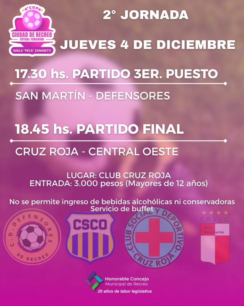 El Concejo Municipal de Recreo invita a la segunda y última fecha de la 4° Copa Ciudad de Recreo de Fútbol Femenino Naila Peca Zaninetti, luego de las reprogramaciones por las condiciones climáticas.