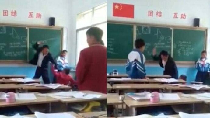 Al ver que el estudiante en cuestión estaba siendo agredido físicamente por otro, el docente se quitó el cinturón y comenzó a pegarle en los glúteos al alumno que estaba golpeando a su compañero.