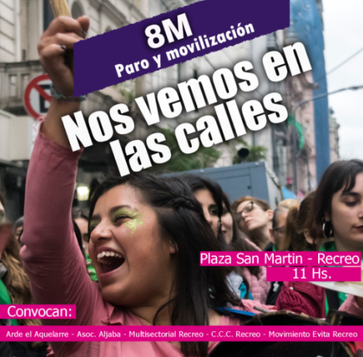 Hoy se hará una marcha en la ciudad, desde las 11hs en Plaza San Martín, en conmemoración por el #8M en pos de la lucha por la reivindicación de los derechos, fomentando la equidad y el respeto hacia las mujeres. En este caso, el encuentro es convocado por diferentes entidades locales: Arde el Aquelarre, Asociación Aljaba, Multisectorial Recreo, C.C.C Recreo, Movimiento Evita Recreo. Se invita a todas las mujeres que deseen acercarse.