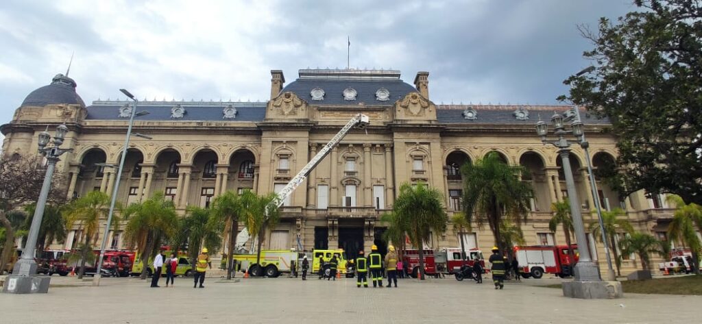 Una importante cantidad de motobombas y camionetas de rescate de bomberos se concentraron frente a la Casa de Gobierno, incluso bomberos de la ciudad de Recreo.
