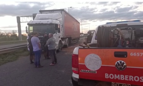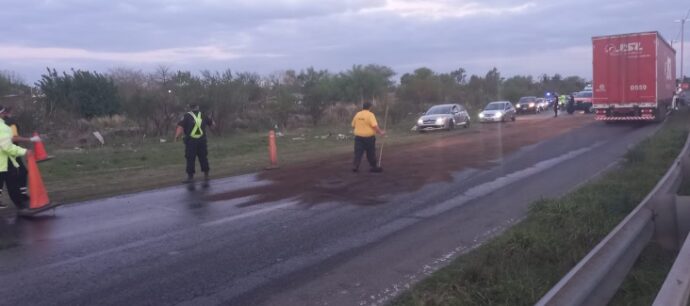 Al cruzarse de mano, el tanque de gasoil del camión fue impactado por el guardarraíl y todo el líquido se esparció por la calzada, en la misma dirección que el camión quedó frenado. Los bomberos taparon el líquido con aserrín por lo que el paso estuvo detenido durante una media hora.