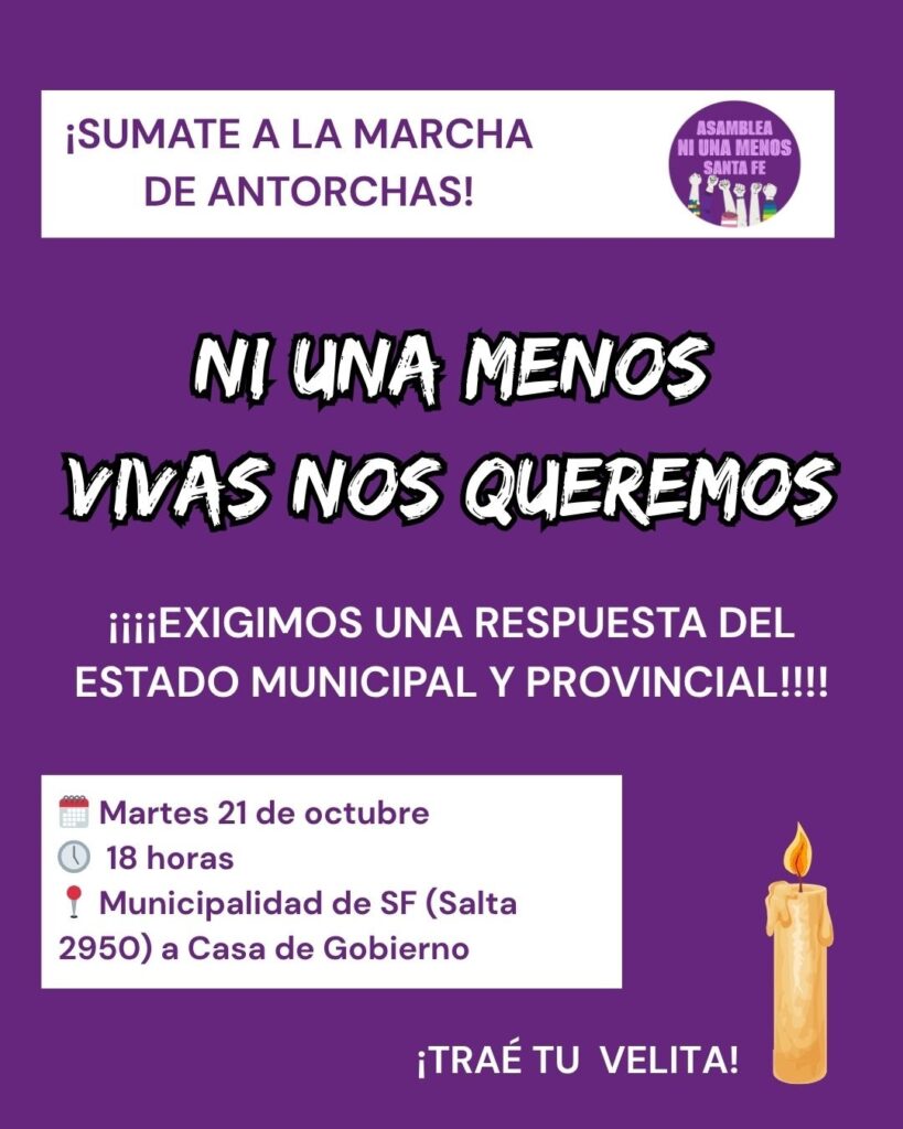 La Asamblea Ni Una Menos Santa Fe convoca a una nueva jornada de movilización bajo la consigna “¡Ni una menos, vivas y libres nos queremos!”. Será este martes 21 de octubre a las 18 horas, con una marcha de antorchas que partirá desde la explanada de la Municipalidad de Santa Fe (Salta 2950) hacia la Casa de Gobierno provincial.