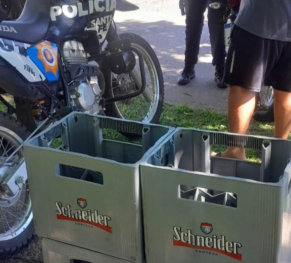 Personal de la Brigada Motorizada observó a los jóvenes caminando por el Parque Garay con cuatro cajones de cerveza vacíos y, al notar la presencia policial, se ocultaron detrás de un árbol simulando descansar.