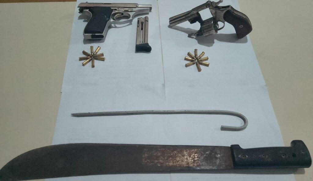 En el procedimiento se secuestró una pistola Bersa modelo Thunder calibre 22 con siete municiones en recámara, un revólver marca Pasper calibre 22 con ocho cartuchos intactos, además del machete y el elemento punzante.