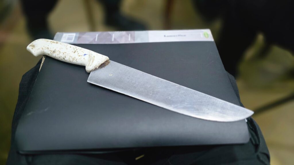 Durante el chequeo, los policías secuestraron una cuchilla de carnicero de gran porte, de 40 centímetros de largo, con cabo plástico blanco de 15 cm y una hoja de acero de 25 cm. El individuo fue trasladado en calidad de aprehendido a la Estación Sur, donde quedó a disposición de la Justicia.
