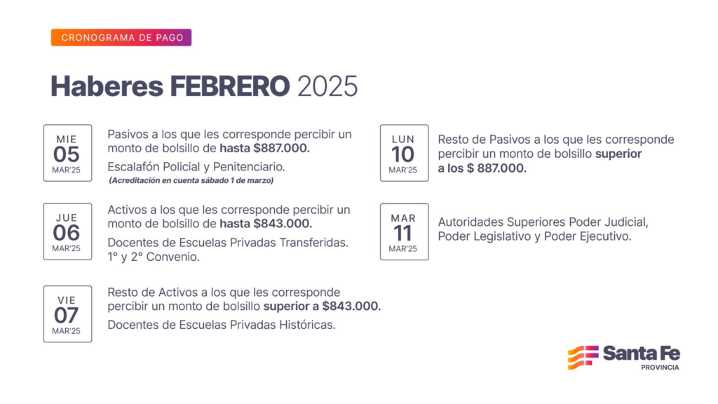El Gobierno Provincial, a través del Ministerio de Economía, informó que los haberes del mes de febrero se percibirán a partir del miércoles 5 -el primer turno correspondiente al escalafón policial y pasivos que cobren hasta $887.000 lo tendrá acreditado el sábado 1°-, finalizando el pago para el personal de planta del Estado y jubilados el sábado 8. En tanto que las autoridades superiores lo cobrarán el martes 11.