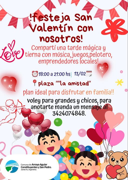 Organizado por la Comuna de Arroyo Aguiar, Constituyentes y San Pedro con la gestión que encabezan Hernán Carraro y Gisela Favre, se realizará este viernes 13 de febrero, en plaza La Amistad, la celebración de San Valentín.
