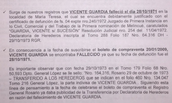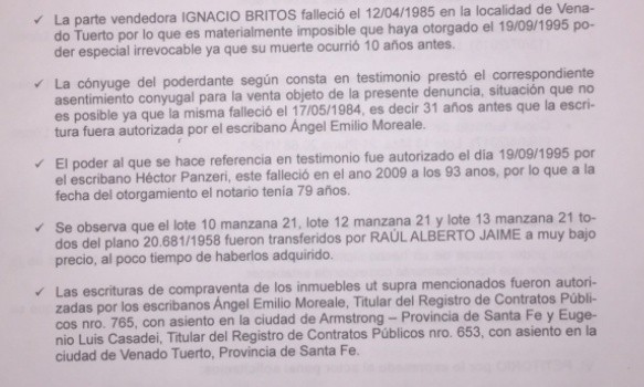 De acuerdo a la denuncia, Britos otorgó el 19 de septiembre de 1995, diez años después de su fallecimiento, un poder especial irrevocable a una persona, que fue la encargada de hacer el traspaso de manos de los tres terrenos.
