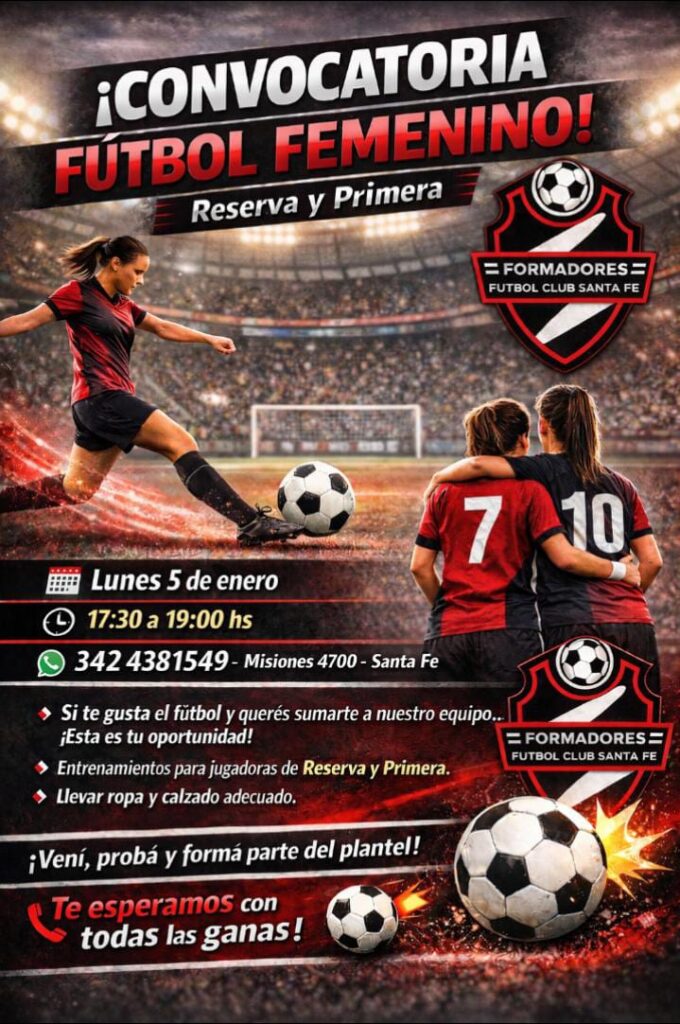 Para esta tarde, a partir de las 17.340 y hasta las 19 Formadores Fútbol Club Santa Fe lanzó una convocatoria para incorporar jugadoras a las divisiones primera y reserva, de cara a la temporada 2026. La cita será en calle Misiones 4700 de la ciudad Capital provincial.