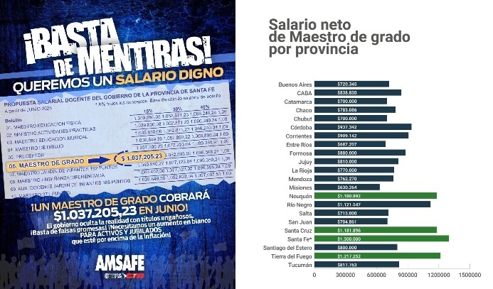 Desde AMSAFE respondieron que los datos oficiales son “falsos” y aseguraron que el acta paritaria establece para junio un salario de $1.037.205,23 para un maestro de grado. Además, cuestionaron la inclusión de sumas no remunerativas y señalaron que el esquema propuesto afecta la escala salarial y a los jubilados.