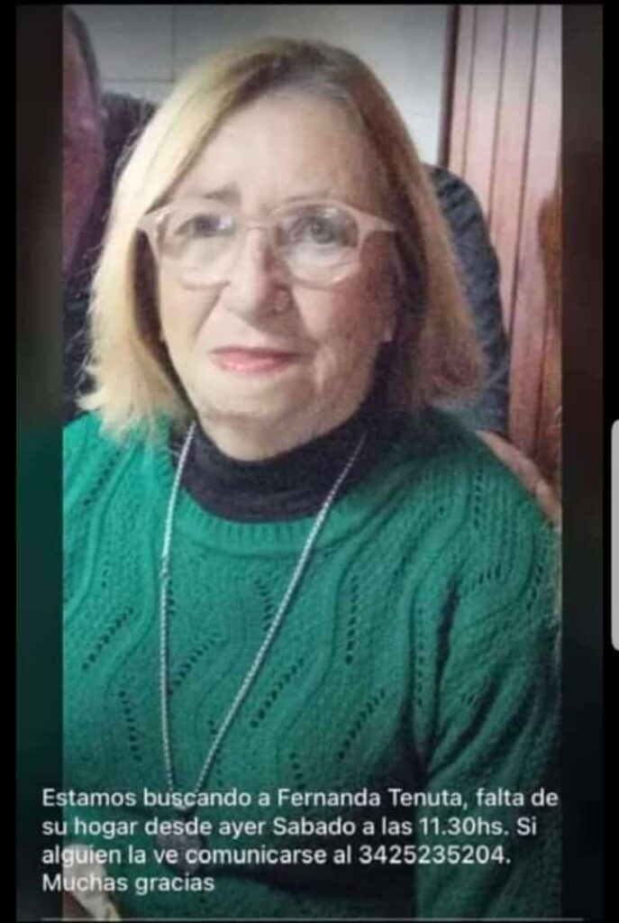 Fernanda Tenuta tiene 78 años y fue vista por última vez ayer sábado en su domicilio. Las informaciones indican que la mujer posiblemente tomó el colectivo de linea para Santa Fe.