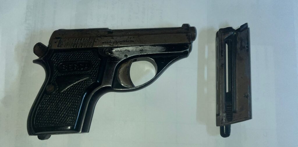 Durante el chequeo de rutina, los agentes detectaron entre sus prendas un arma de fuego calibre 22, que se encontraba a la altura del tobillo izquierdo y con su cargador colocado.