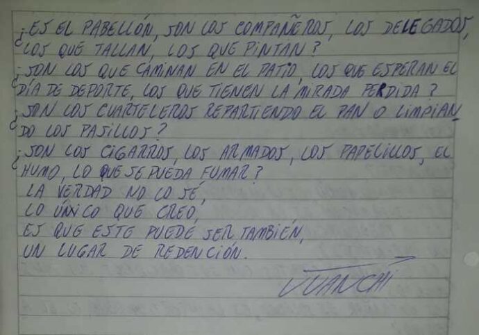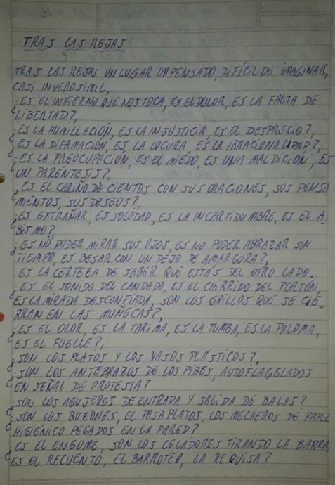 Titulado «Tras las rejas», el escrito habla de la habla de la cárcel como un lugar «difícil de imaginar, impensado y casi inverosímil». Mediante preguntas en frases sueltas se interroga sobre qué representa en verdad estar privado de libertad. Habla de un «infierno, de dolor… Humillación, injusticia y desprecio» están entre las expresiones elegidas al comienzo de un texto que contiene descripción y carga emotiva.