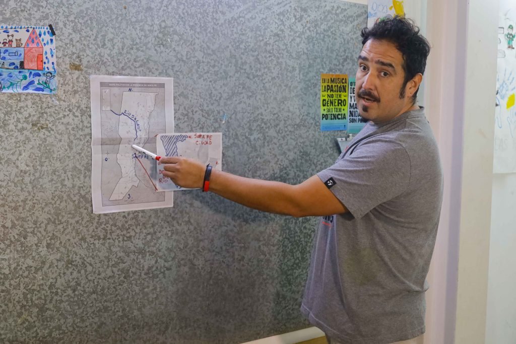 El trabajo en las pizarras y mesas de las Estaciones incluye herramientas como mapas e imágenes que sirven para entender el comportamiento del río de la región. Sarcos precisó: “Trabajamos el tema de la historia, el cauce del río, la parte geográfica y cómo eso afectó a la ciudad. También la cuestión cartográfica tratando de ampliar varios temas con la cuestión de la inundación”.