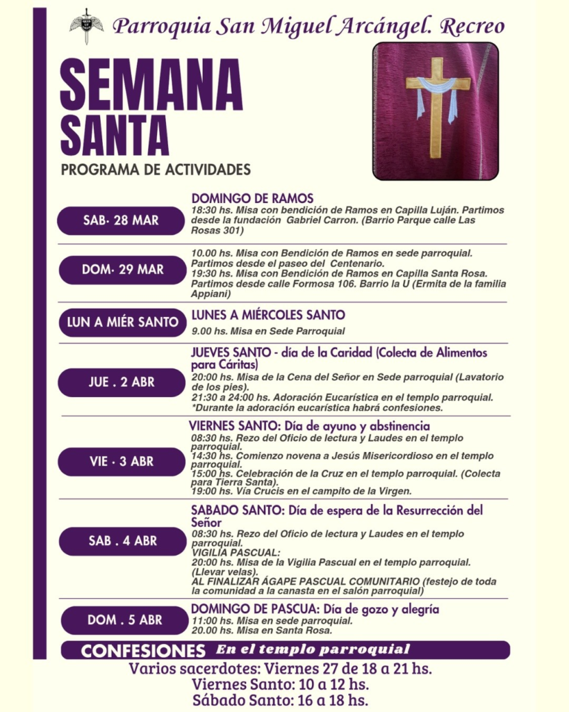 La Parroquia San Miguel Arcángel de Recreo dio a conocer el cronograma de actividades previstas para Semana Santa, que comenzarán este fin de semana con el Domingo de Ramos y se extenderán hasta el Domingo de Pascua, con celebraciones religiosas y propuestas abiertas a la comunidad.