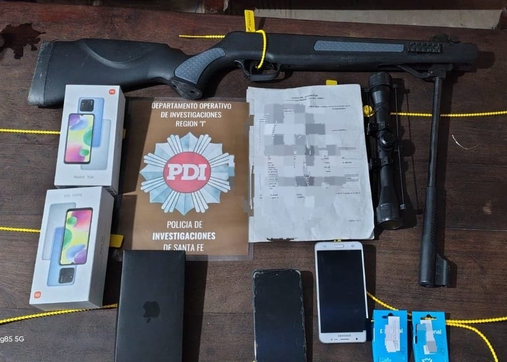 Durante el procedimiento, los agentes secuestraron distintos elementos considerados de interés para la causa, entre ellos un motovehículo, dispositivos electrónicos, documentación relacionada con un automóvil, blísteres de tarjetas SIM, un rifle de aire comprimido y una mira telescópica.