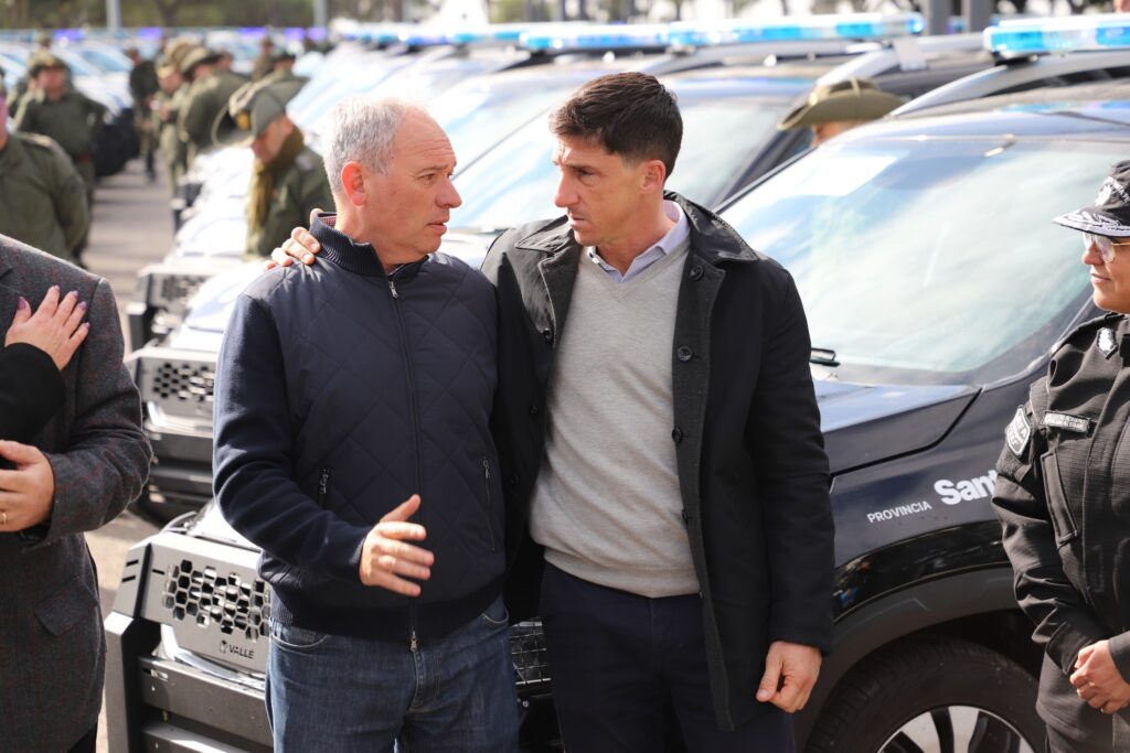 El intendente de Laguna Paiva, Elvio Omar Cotterli, junto a la concejal Yanina Catinot, participaron de la entrega de tres nuevos móviles policiales 0km para reforzar la seguridad en la ciudad, en un acto que fue encabezado por el gobernador de la provincia de Santa Fe, Maximiliano Pullaro.