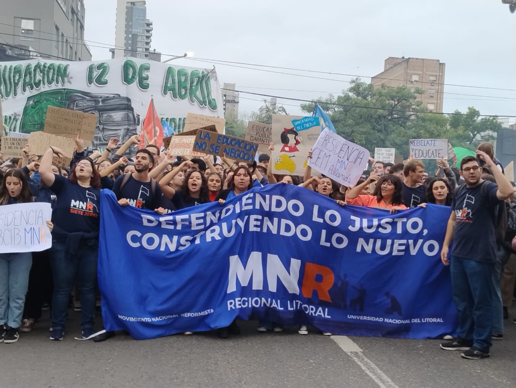 En Santa Fe, la actividad comenzó a las 16 horas en la Facultad de Ingeniería Química, desde donde los manifestantes se movilizaron hacia el rectorado de la UNL donde se realizó un acto y un abrazo simbólico.