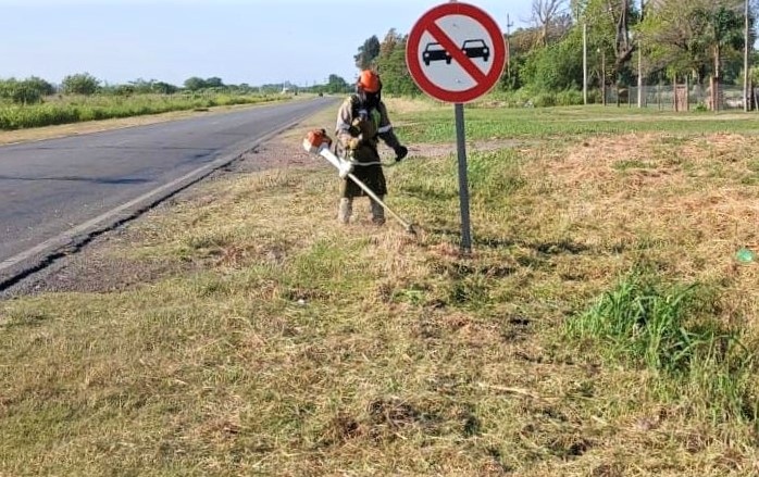 Otro frente de mantenimiento comprende el corte de pasto y despeje de barandas y cartelería, desde el cruce con RP 70 hacia Candioti.