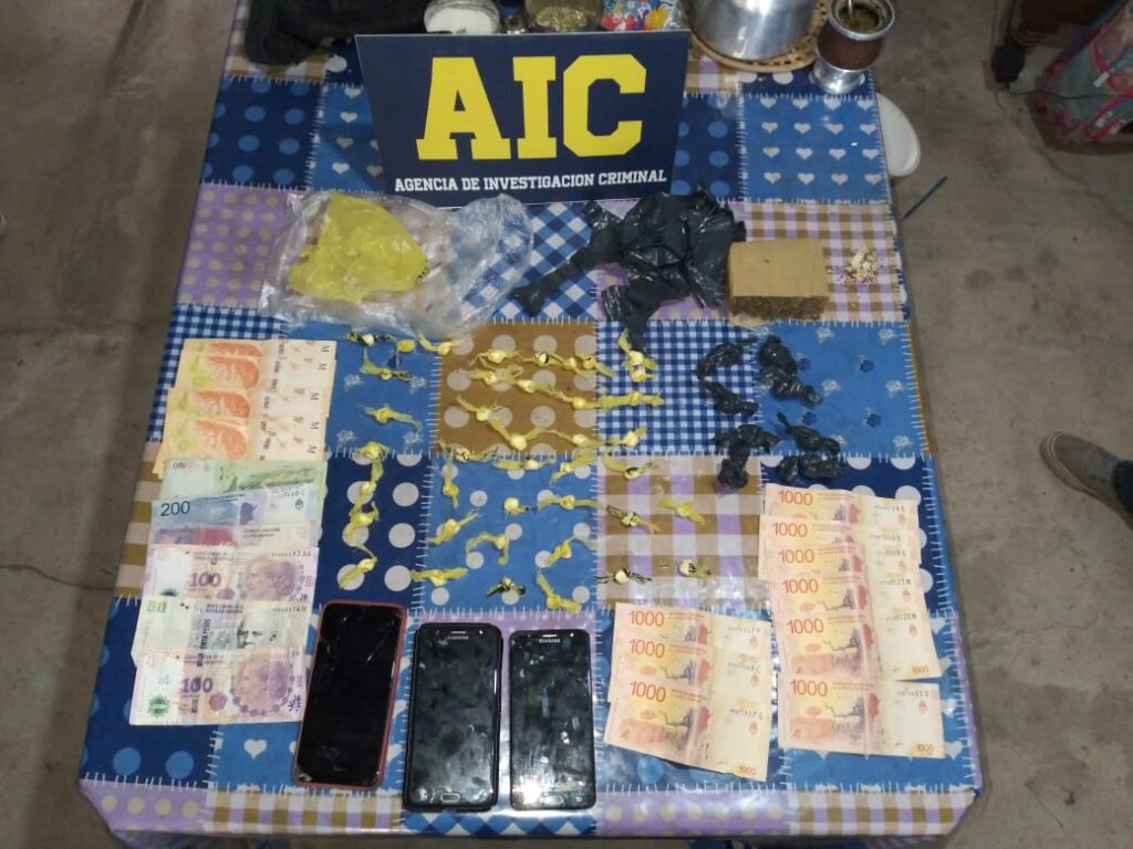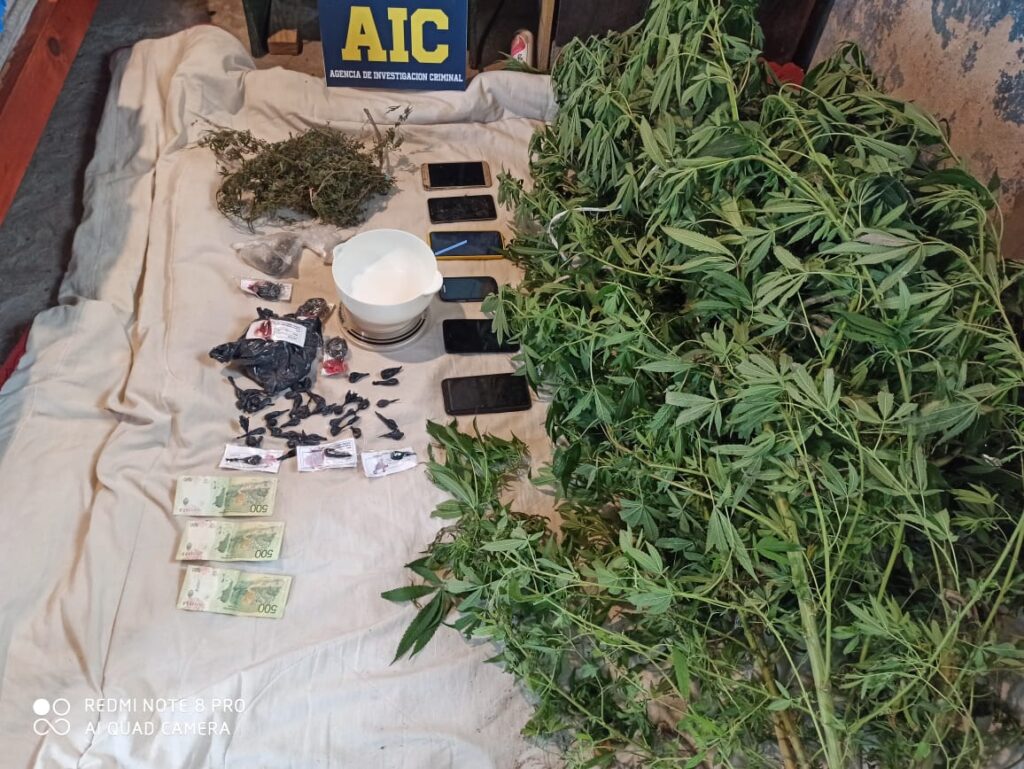 En el lugar, los investigadores incautaron material estupefaciente: 1 kg de cocaina fraccionado para su comercialización y marihuana por más de 1200 gr. en diferentes envoltorios para la venta y plantas.