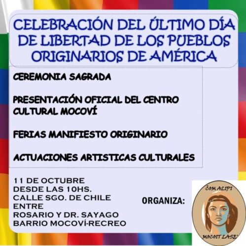El lunes 11 de octubre desde las 10 de la mañana en nuestra ciudad se realizará celebración del último día de Libertad de los Pueblos Originarios de América. La actividad se concretará en calle Santiago de Chile entre Rosario y Dr. Sayago de barrio Mocoví de Recreo.