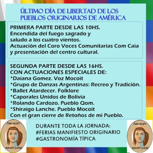 Será este 11 de octubre en barrio Mocoví de nuestra ciudad. Las actividades son llevadas adelante por la organización “Somos Mujeres Mocovíes”. Habrá actuaciones artísticas culturales.