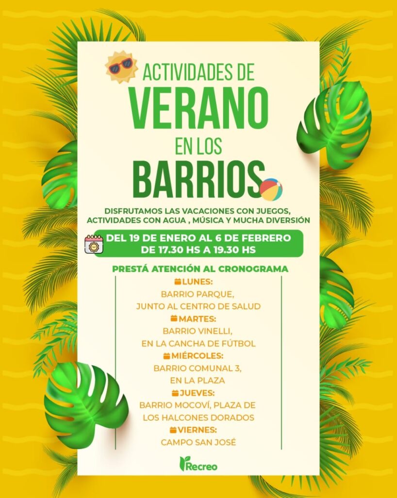 La Municipalidad de Recreo informó que durante el verano se llevarán adelante actividades recreativas en distintos barrios de la ciudad, pensadas para niñas, niños y familias.
