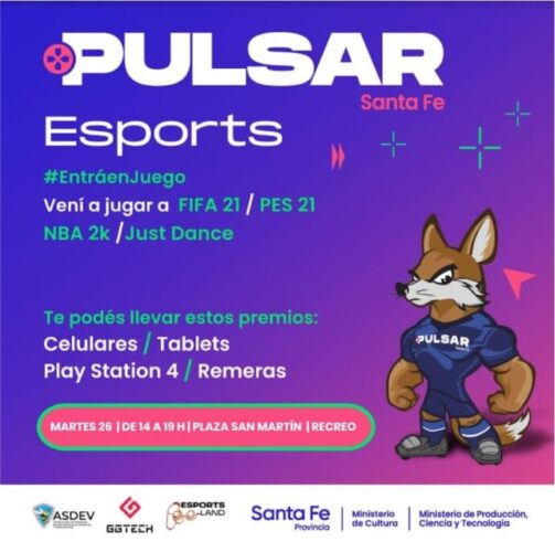 Pulsar Santa Fe – Exhibición y Mercado de Contenidos, es un evento gratuito que se presenta en formato virtual y presencial, que comenzó a desarrollarse el pasado 6 de octubre y culminará el 9 de noviembre. El objetivo del mismo es impulsar proyectos audiovisuales de largometrajes, cortometrajes, series, animación, videojuegos, nuevas narrativas y deportes electrónicos en su vínculo tanto con la tecnología como con los nuevos sistemas de producción y comercialización de la industria. En Recreo, la edición de PULSAR invita a personas de todas las edades a jugar los deportes electrónicos League of Legends / FIFA 21 / PES 21 / NBA 2K. / Rocket League / Clash Royale / Just Dance, y participar por importantes premios: celulares, tablets, remeras gamer que se entregarán en la jornada y además ingresarán a participar por un sorteo final con todos aquellos que participen en las diferentes localidades de la provincia por una PlayStation 4.