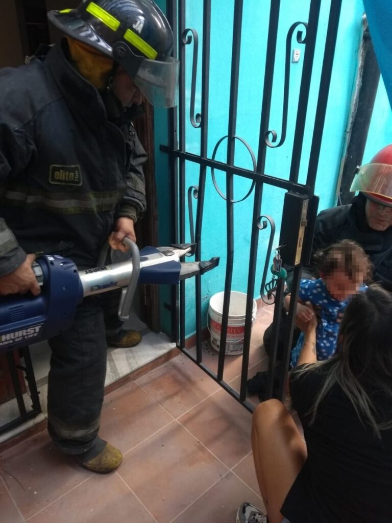 Este lunes por la tarde, bomberos del Cuartel de Santa Fe, trabajaron en la asistencia a una niña de dos años en un departamento ubicado en Balcarce al 1500, que tenía su cabeza atrapada entre unas rejas.