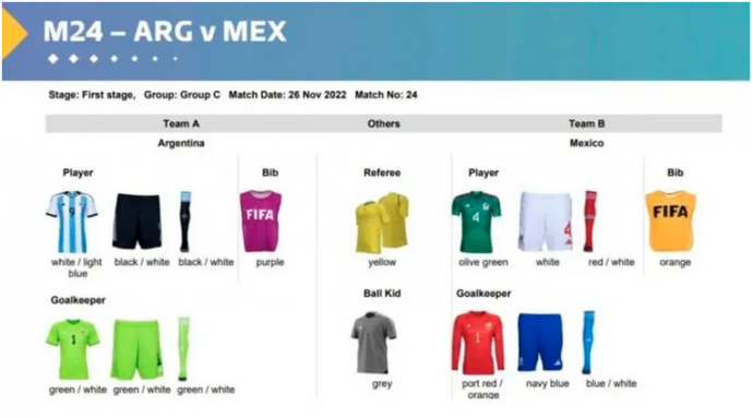 A falta de, poco menos, de 72 horas para el debut de la selección argentina en el mundial de Qatar 2022, la pagina oficial de la FIFA confirmó la indumentaria que usara el combinado nacional en sus tres partidos del Grupo C.