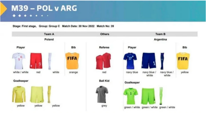 Esto pese a que la selección polaca tiene camiseta de color blanco, también influye el hecho de que Argentina ocupará el lugar de equipo visitante en este partido.