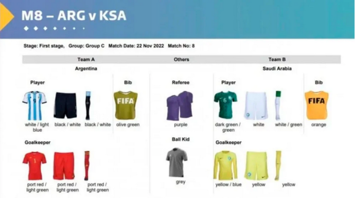 En este encuentro, Argentina lucirá su clásica camiseta celeste y blanca, acompañada de shorts y medias negras, mientras que el arquero argentino estará vestido completamente de rojo. Por su parte la selección árabe vestirá íntegramente de verde.