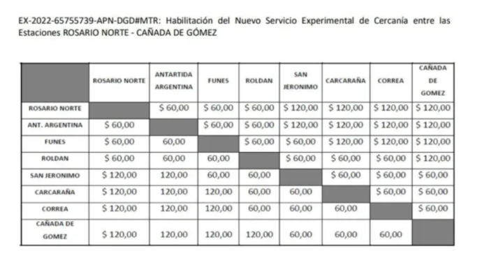 En vísperas de la puesta en marcha de la línea regional, el Gobierno nacional confirmó el precio de los pasajes del tren Rosario-Cañada de Gómez. De acuerdo a la resolución del Ministerio de Transporte, se trata de valores promocionales durante un año a partir de la implementación de la conexión en el sur de Santa Fe.
