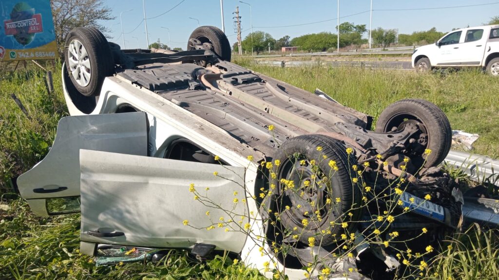 Por causas que se investigan, un Citroën C3 que circulaba de oeste a este perdió el control, salió de la cinta asfáltica y terminó impactando contra los guardarraíles del cruce, para luego volcar entre la Ruta 11 y las vías del ferrocarril.