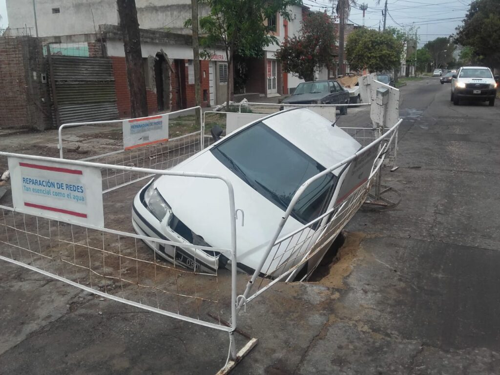 Tras el hundimiento en el socavón, el auto quedó totalmente atascado y con graves roturas.