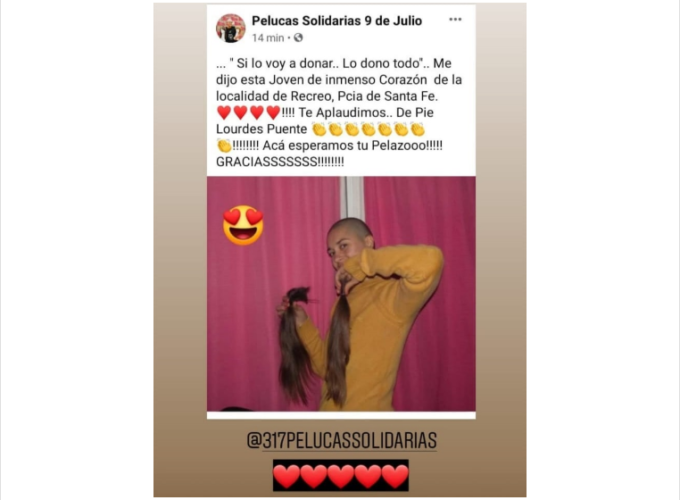 Se trata de una joven de 15 años, oriunda de nuestra ciudad. Que el sábado por la noche, cortó su cabello para donarlo a la «Fundación pelucas solidarias 9 de julio» luego de contactarse con Rita, quien está a cargo de la ONG que se encarga de recaudar y generar recursos para la producción de pelucas de cabello natural, que posteriormente se distribuyen de manera gratuita entre pacientes que llevan adelante tratamientos oncológicos. Lourdes muy contenta por su accionar, expresó: «La semana que viene envío el cabello a través de Correo Argentino. Fue algo que siempre lo quise hacer pero nunca llegaba a los centímetros requeridos. Y cuando me di cuenta los superé, por ese motivo cuando me consultaron no dudé y dije que si lo dono, lo dono todo.»