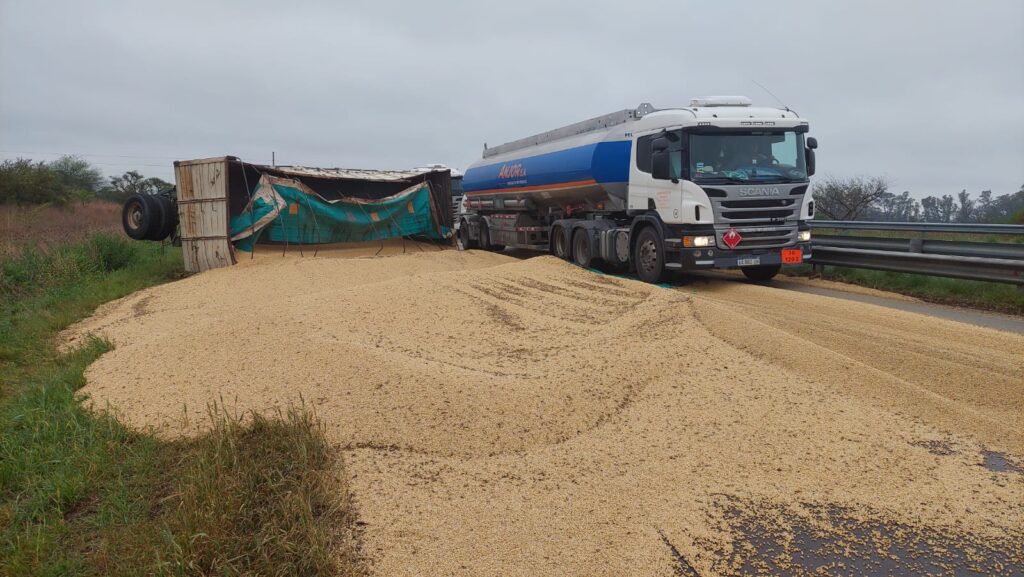 No participaron otros rodados y principio fue por un desperfecto mecánico donde se desprende el enganche para acoplado generando el vuelco con la carga de soja.