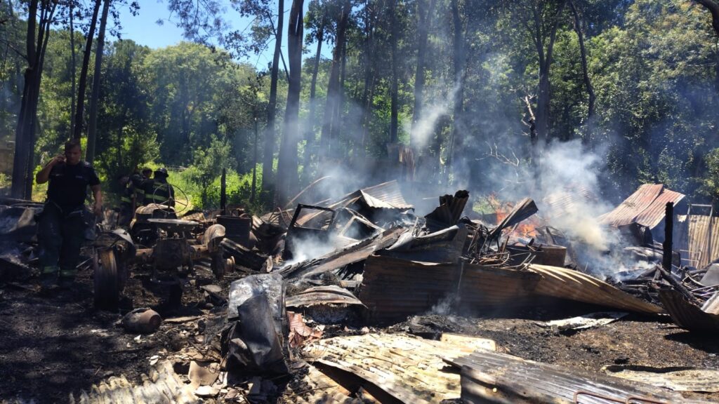 Dentro del galpón había herramientas, madera, tanques con combustible y dos tractores, lo que incrementó el riesgo durante las tareas de extinción.
