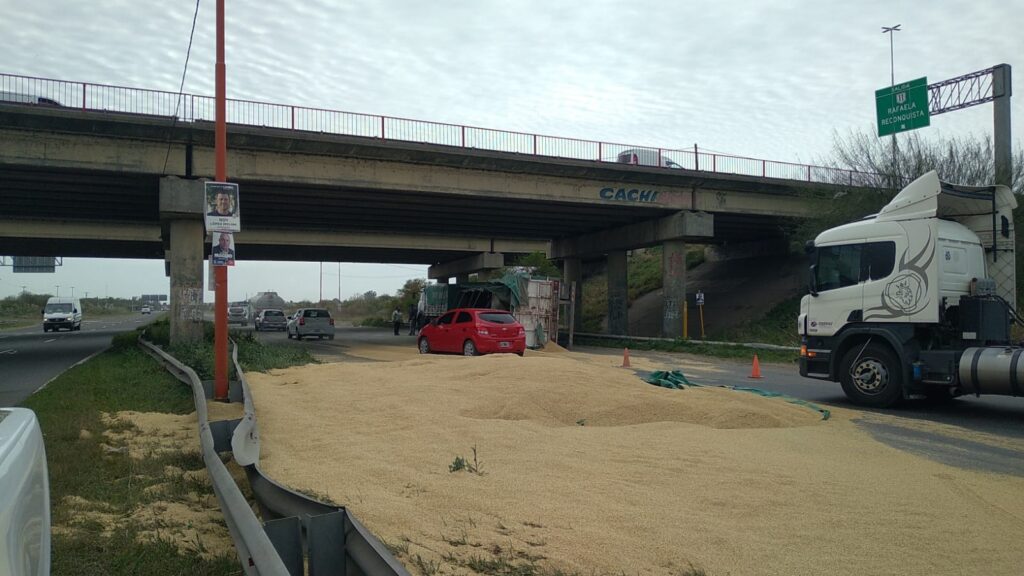 Este mediodía un camión cerealero tumbó su acoplado. La carga se derramó en ambos carriles mano hacia el sur y trajo importantes demoras.